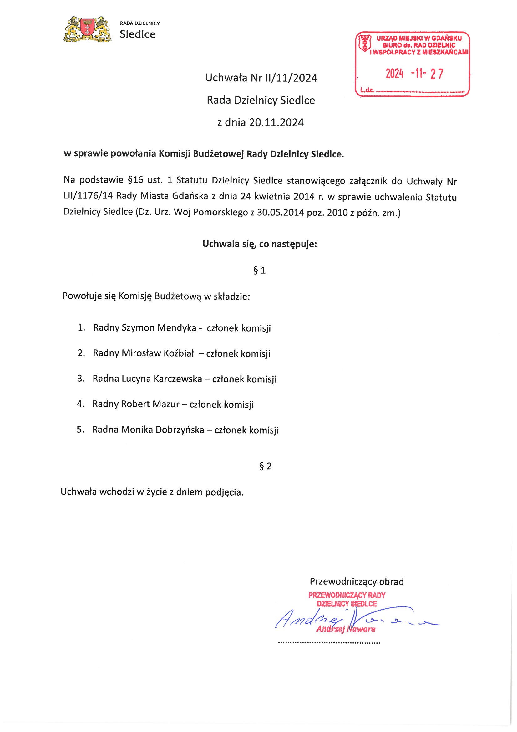 Uchwała nr I/11/2024 w sprawie powołania Komisji Budżetowej Rady Dzielnicy Siedlce