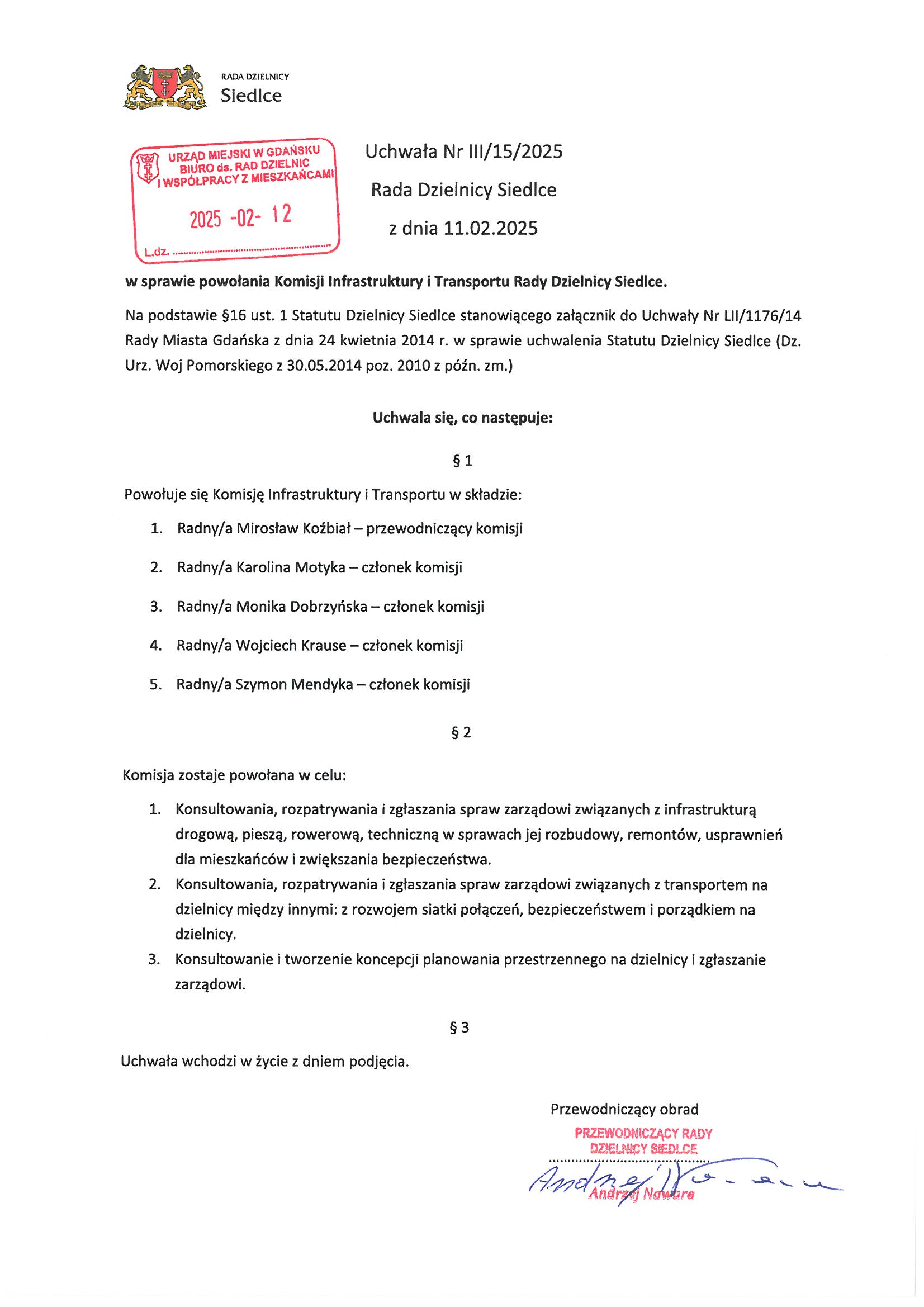 Uchwała nr III/15/2025 w sprawie powołania Komisji Infrastruktury i Transportu