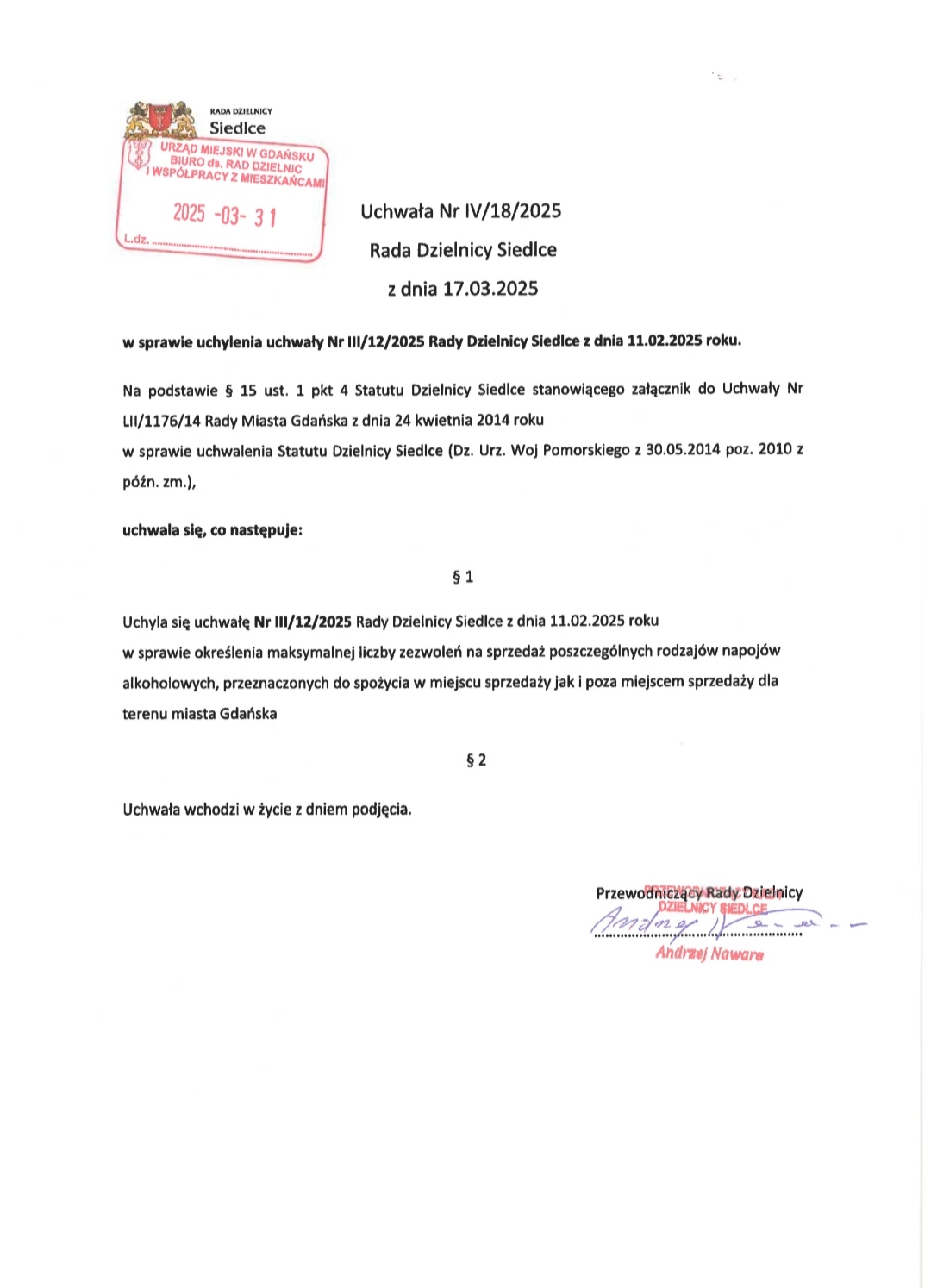 Uchwała Nr IV/18/2025 w sprawie uchylenia uchwały III/12/2025 Rady Dzielnicy Siedlce z dnia 11.02.2025 roku