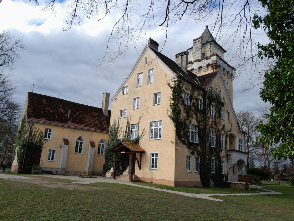 Na zdjęciu widnieje okazały, jasnokremowy budynek w stylu pałacowym z wieżyczką i stromym dachem, częściowo porośnięty bluszczem. Otoczony zielenią i starymi drzewami, prezentuje się malowniczo na tle pochmurnego, ale jasnego nieba.
