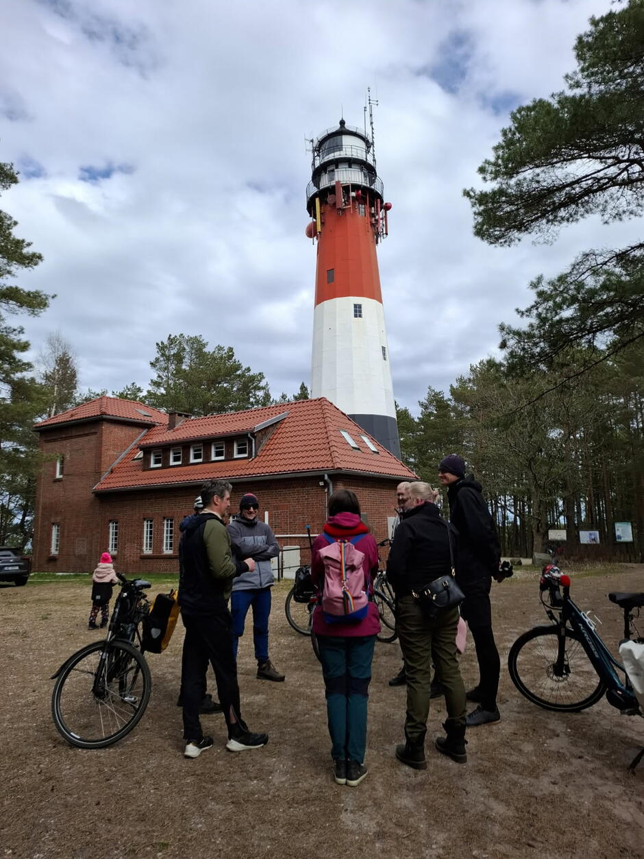 Zdjęcie przedstawia grupę rowerzystów rozmawiających u stóp charakterystycznej latarni morskiej Stilo, która wyróżnia się trójkolorowym malowaniem: czerwonym, białym i czarnym. Otoczona lasem i ceglaną zabudową latarnia tworzy malownicze tło dla turystycznej przerwy w leśnej scenerii.