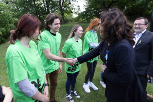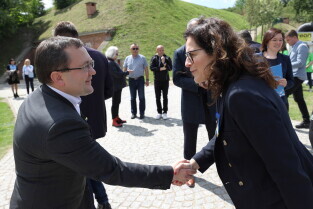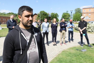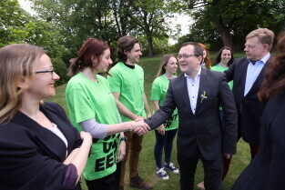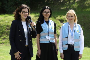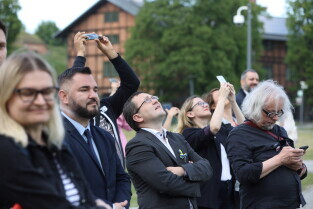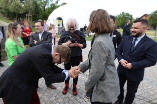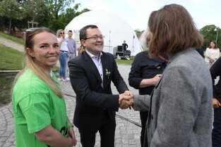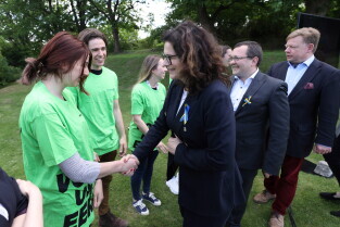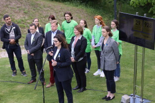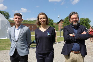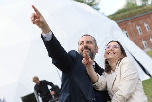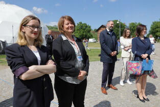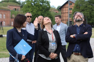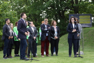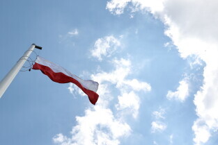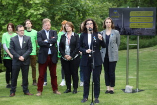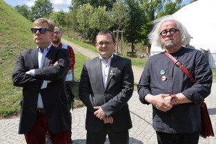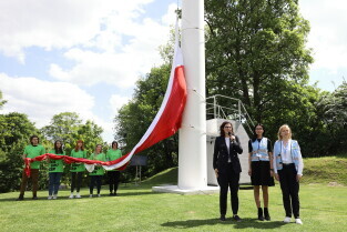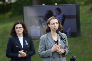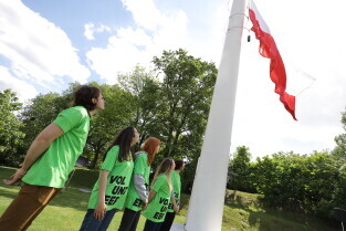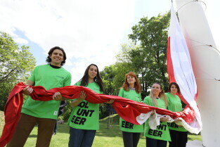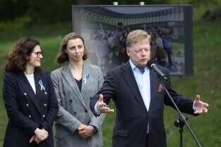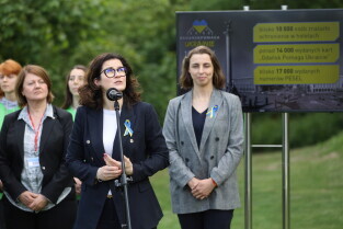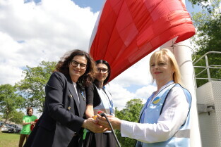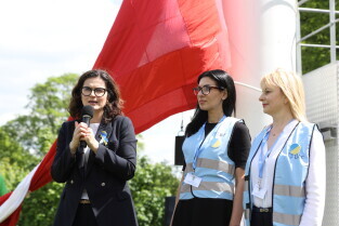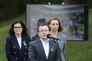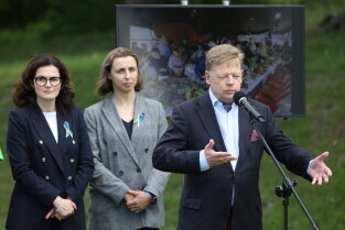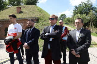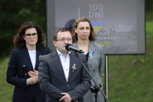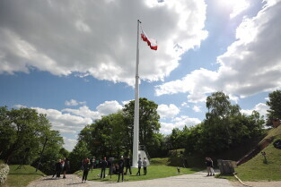 Gdańsk, Góra Gradowa. Briefing prasowy, podsumowane dotychczasowych działań w ramach akcji "Gdańsk Pomaga Ukrainie". Na maszt podniesiona została biało-czerwona patchworkowa flaga uszyta podczas Święta Wolności i Solidarności w 2019 roku.