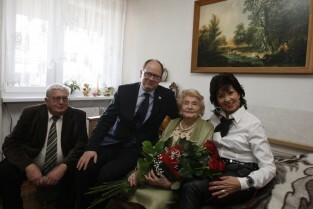 Prezydent Gdańska Paweł Adamowicz złożył życzenia gdańszczance, Pani Elizie Nielubszyc, która obchodzi 100. urodziny. Po prawej córka Krystyna Lis, a po lewej zięć Mieczysław Lis.