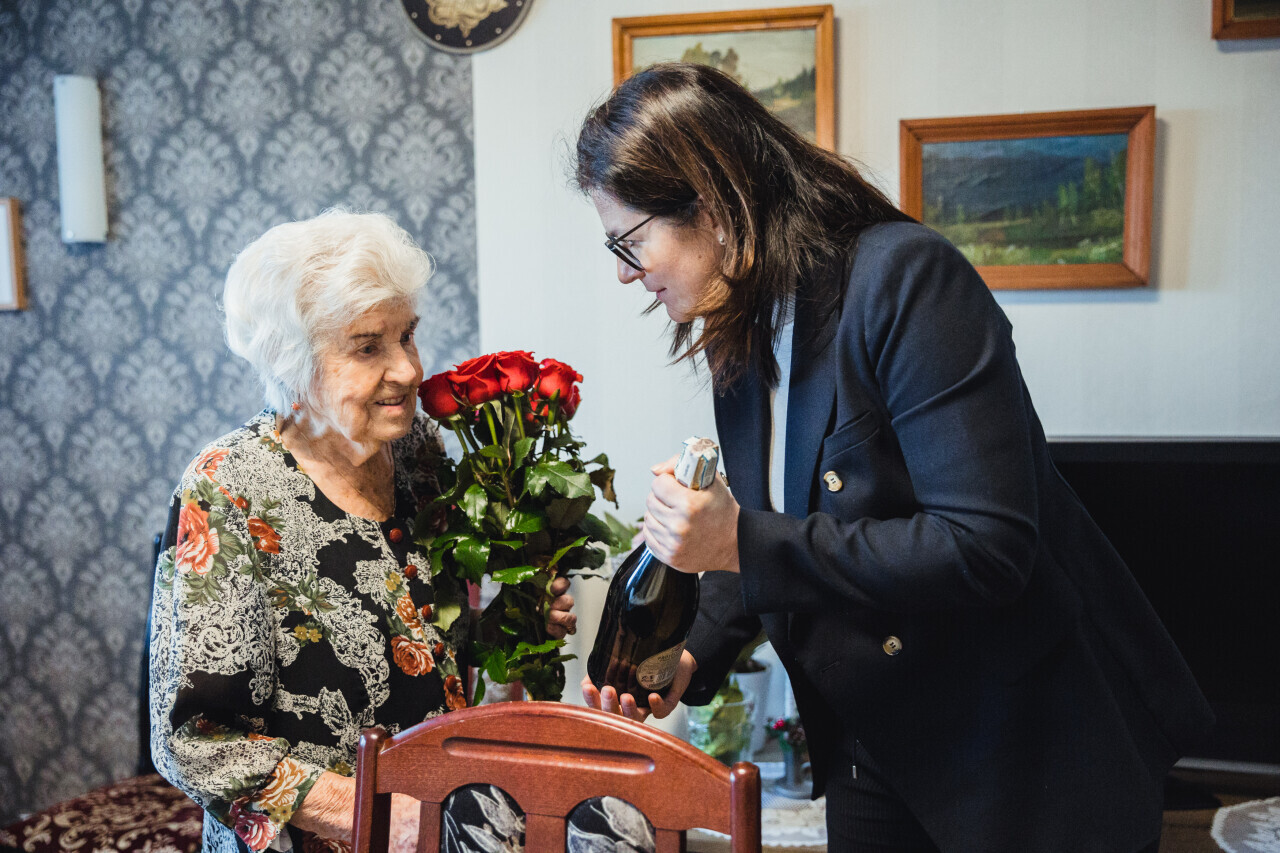 Gdańsk. 102. urodziny Pani Ireny Świderskiej. Życzenia urodzinowe solenizantce złożyła prezydent Gdańska Aleksandra Dulkiewicz