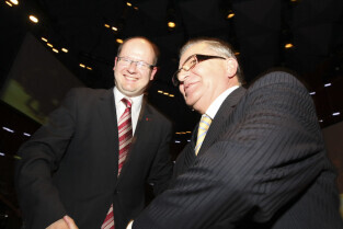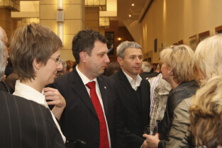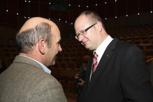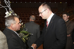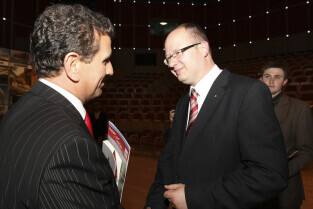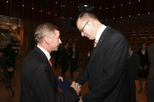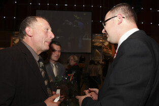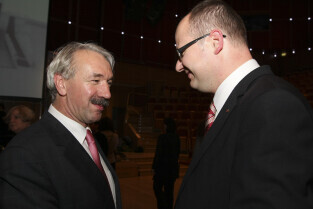Uroczystość 10-lecia Prezydentury Pawła Adamowicza. Gdańsk, Filharmonia Bałtycka. Nz. Piotr Sojka i Paweł Adamowicz