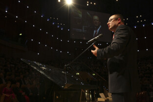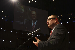 Uroczystość 10-lecia Prezydentury Pawła Adamowicza. Gdańsk, Filharmonia Bałtycka. Nz. Paweł Adamowicz