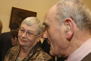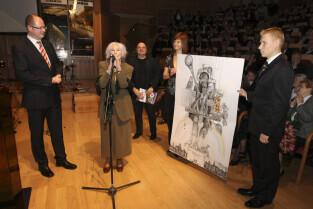 Uroczystość 10-lecia Prezydentury Pawła Adamowicza. Gdańsk, Filharmonia Bałtycka. Nz. Halina Słojewska wręcza Pawłowi Adamowiczowi jego karykaturę, której autorem jest Marian Kołodziej