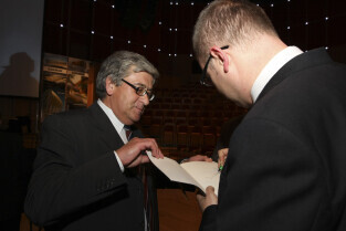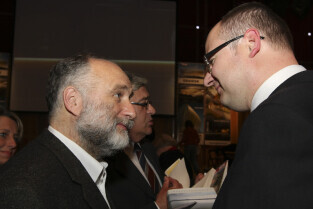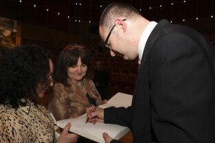 Uroczystość 10-lecia Prezydentury Pawła Adamowicza. Gdańsk, Filharmonia Bałtycka. Nz. Paweł Adamowicz wpisuje dedykację Krzysztofowi Skibie dedykację do swojej książki "Gdańsk jako wyzwanie"