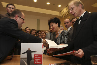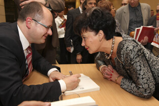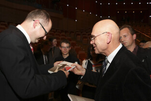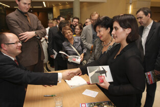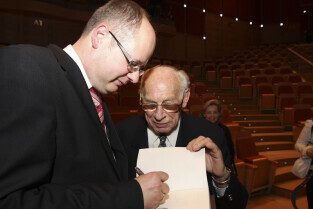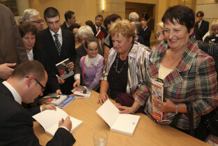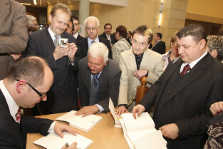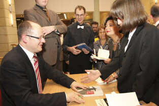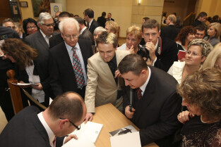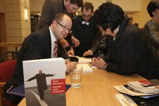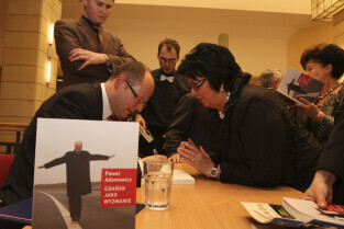 Uroczystość 10-lecia Prezydentury Pawła Adamowicza. Gdańsk, Filharmonia Bałtycka. Nz. Paweł Adamowicz podpisuje swoją nową książkę "Gdańsk jako wyzwanie"