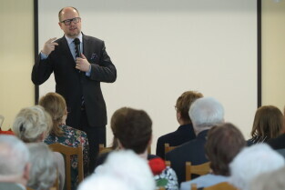 Gdańsk, Dom Pomocy Społecznej "Ostoja". 10-lecie Klubu Seniora. Nz. Prezydent Gdańska Paweł Adamowicz.