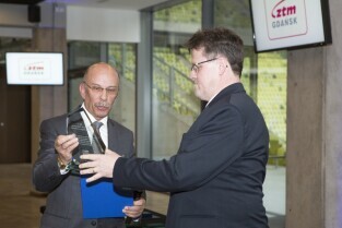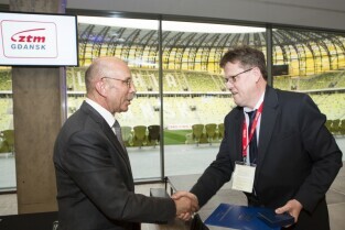 Uroczystość 10. rocznicy powstania Zarządu Transportu Miejskiego. Gdańsk, PGE Arena. Nz. po lewej Prezes Izby Gospodarczej Komunikacji Miejskiej Adam Karolak, po prawej Dyrektor ZTM Jerzy Dobaczewski