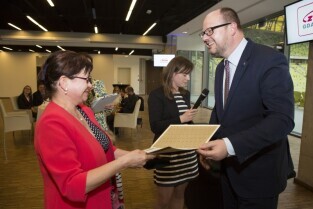 Uroczystość 10. rocznicy powstania Zarządu Transportu Miejskiego. Gdańsk, PGE Arena. Nz. Prezydent Gdańska Paweł Adamowicz wręcza medale PMG, po lewej Z-ca Dyrektora ZTM Alicja Kraska