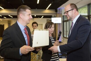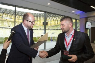 Uroczystość 10. rocznicy powstania Zarządu Transportu Miejskiego. Gdańsk, PGE Arena. Nz. Prezydent Gdańska Paweł Adamowicz wręcza medale PMG, po prawej Z-ca Dyrektora ZTM Sebastian Zomkowski