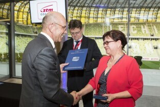 Uroczystość 10. rocznicy powstania Zarządu Transportu Miejskiego. Gdańsk, PGE Arena. Nz. po lewej Prezes Izby Gospodarczej Komunikacji Miejskiej Adam Karolak, po prawej Z-ca Dyrektora ZTM Alicja Kraska