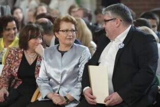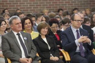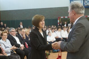 Gdańsk Jasień. Uroczyste obchody 10-lecia nadania Gimnazjum nr 48 imienia Lecha Bądkowskiego. Nz. Pomorski Kurator Oświaty Elżbieta Wasilenko i Dyrektor Wydziału Rozwoju Społecznego UMG Piotr Kowalczuk