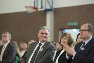 Gdańsk Jasień. Uroczyste obchody 10-lecia nadania Gimnazjum nr 48 imienia Lecha Bądkowskiego. Nz. od lewej: Przewodniczący Rady Miasta Gdańska Bogdan Oleszek, Dyrektor Gimnazjum nr 48 Elżbieta Radomska i Prezydent Gdańska Paweł Adamowicz
