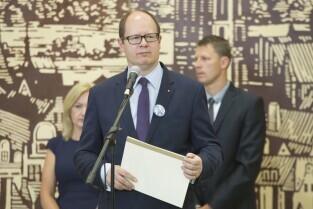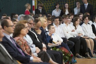 Gdańsk Jasień. Uroczyste obchody 10-lecia nadania Gimnazjum nr 48 imienia Lecha Bądkowskiego. Nz. Prezydent Gdańska Paweł Adamowicz
