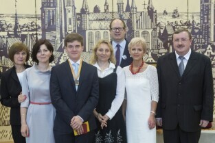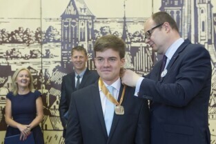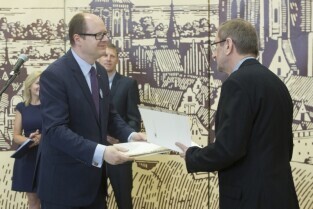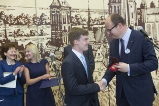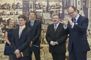 Gdańsk Jasień. Uroczyste obchody 10-lecia nadania Gimnazjum nr 48 imienia Lecha Bądkowskiego. Nz. Prezydent Gdańska Paweł Adamowicz wręcza medal dla najlepszego ucznia