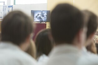 Gdańsk Jasień. Uroczyste obchody 10-lecia nadania Gimnazjum nr 48 imienia Lecha Bądkowskiego. Nz. córka Lecha Bądkowskiego, Sławina Kosmulska