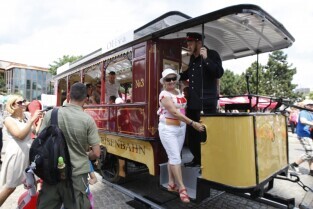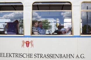 Gdańsk. Festyn z okazji 140-lecia tramwajów w mieście na Targu Węglowym oraz parada zabytkowych i współczesnych pojazdów pomiędzy Urzędem Miejskim, a Bramą Wyżynną. Nz. tramwaj Bergmann z 1927 r.