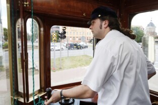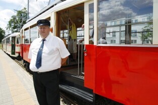 Gdańsk. Festyn z okazji 140-lecia tramwajów w mieście na Targu Węglowym oraz parada zabytkowych i współczesnych pojazdów pomiędzy Urzędem Miejskim, a Bramą Wyżynną. Nz. motorniczy tramwaju Bergmann z 1927 r.