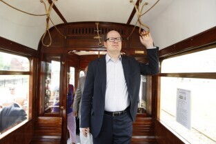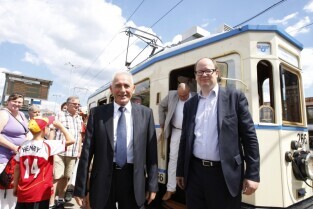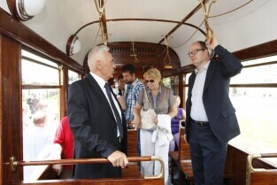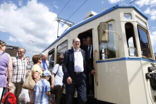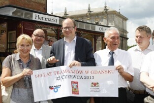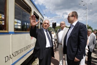 Gdańsk. Festyn z okazji 140-lecia tramwajów w mieście na Targu Węglowym oraz parada zabytkowych i współczesnych pojazdów pomiędzy Urzędem Miejskim, a Bramą Wyżynną. Nz. Prezydent Gdańska Paweł Adamowicz wychodzi z tramwaju Bergmann z 1927 r.