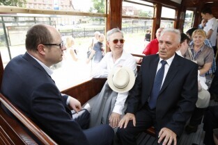 Gdańsk. Festyn z okazji 140-lecia tramwajów w mieście na Targu Węglowym oraz parada zabytkowych i współczesnych pojazdów pomiędzy Urzędem Miejskim, a Bramą Wyżynną. Nz. Prezydent Gdańska Paweł Adamowicz i Prezes ZKM Gdańsk Jerzy Zgliczyński (po prawej) w tramwaju Bergmann z 1927 r.