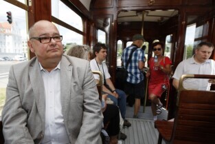 Gdańsk. Festyn z okazji 140-lecia tramwajów w mieście na Targu Węglowym oraz parada zabytkowych i współczesnych pojazdów pomiędzy Urzędem Miejskim, a Bramą Wyżynną. Nz. Prezydent Gdańska Paweł Adamowicz w tramwaju Bergmann z 1927 r.