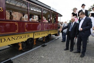 Gdańsk. Festyn z okazji 140-lecia tramwajów w mieście na Targu Węglowym oraz parada zabytkowych i współczesnych pojazdów pomiędzy Urzędem Miejskim, a Bramą Wyżynną. Nz. od lewej: Prezes ZKM Gdańsk Jerzy Zgliczyński i Prezydent Gdańska Paweł Adamowicz przy zabytkowym tramwaju konnym z 1873 r.