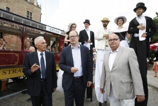 Gdańsk. Festyn z okazji 140-lecia tramwajów w mieście na Targu Węglowym oraz parada zabytkowych i współczesnych pojazdów pomiędzy Urzędem Miejskim, a Bramą Wyżynną. Nz. od lewej: Radny Miasta Gdańska Grzegorz Strzelczyk, Prezydent Gdańska Paweł Adamowicz, Prezes ZKM Gdańsk Jerzy Zgliczyński na tle zabytkowego tramwaju konnego z 1873 r.
