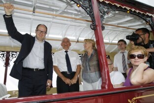 Gdańsk. Festyn z okazji 140-lecia tramwajów w mieście na Targu Węglowym oraz parada zabytkowych i współczesnych pojazdów pomiędzy Urzędem Miejskim, a Bramą Wyżynną. Nz. Prezydent Gdańska Paweł Adamowicz i Prezes ZKM Gdańsk Jerzy Zgliczyński w zabytkowym tramwaju konnym z 1873 r.