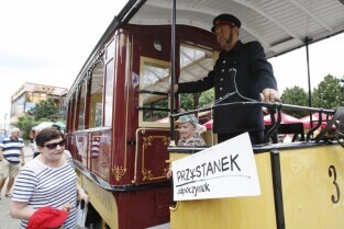 Gdańsk. Festyn z okazji 140-lecia tramwajów w mieście na Targu Węglowym oraz parada zabytkowych i współczesnych pojazdów pomiędzy Urzędem Miejskim, a Bramą Wyżynną. Nz. Radny Miasta Gdańska Grzegorz Strzelczyk