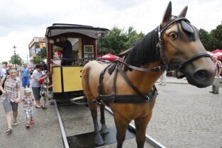 Gdańsk. Festyn z okazji 140-lecia tramwajów w mieście na Targu Węglowym oraz parada zabytkowych i współczesnych pojazdów pomiędzy Urzędem Miejskim, a Bramą Wyżynną. Nz. zabytkowy tramwaj konny z 1873 r.