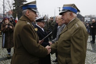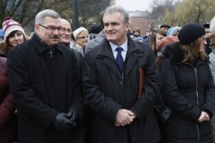 Uroczystości z okazji 145. rocznicy urodzin marszałka Józefa Piłsudskiego. Gdańsk Strzyża, plac marszałka Józefa Piłsudskiego. Nz. od lewej: Przewodniczący Zarządu Regionu Gdańskiego NSZZ "Solidarność" Krzysztof Dośla, Przewodniczący Rady Miasta Gdańska Bogdan Oleszek