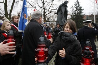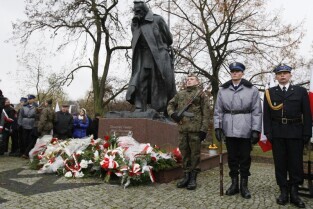 Uroczystości z okazji 145. rocznicy urodzin marszałka Józefa Piłsudskiego. Gdańsk Strzyża, plac marszałka Józefa Piłsudskiego. Nz. od lewej: Przewodniczący Rady Miasta Gdańska Bogdan Oleszek, W-ce Przewodnicząca Rady Miasta Gdańska Agnieszka Owczarczak, Radny Miasta Gdańska Szymon Moś