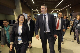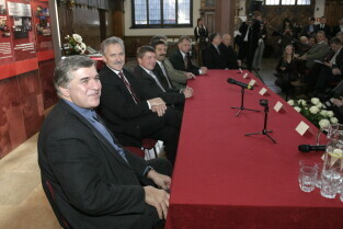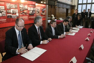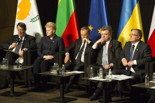 Europejskie Centrum Solidarności. Panel polityków podczas konferencji "Dziedzictwo II Wojny Światowej z perspektywy 70 lat". Nz. od lewej: Prezydent Cypru Nikos Anastasiadis, Prezydent Litwy Dalia Grybauskaitė, Przewodniczący Rady Europejskiej Donald Tusk, Prezydent Ukrainy Petro Poroszenko, Prezydent Polski Bronisław Komorowski