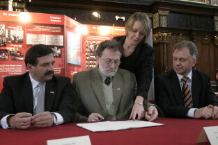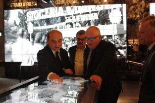 Gdańsk. Ambasador USA w Polsce Mark Brzeziński wraz z Prezydent Gdańska Aleksandrą Dulkiewicz i Dyrektorem ECS Basilem Kerskim zwiedził wystawę Europejskiego Centrum Solidarności.
