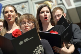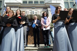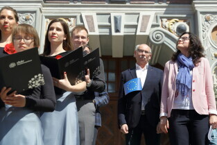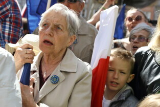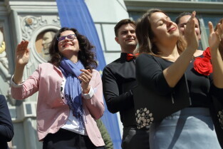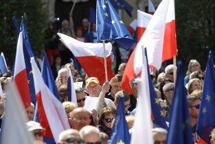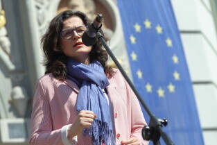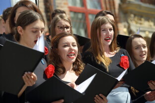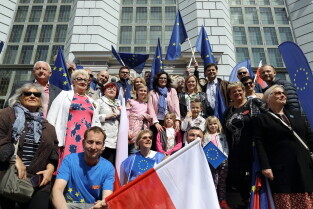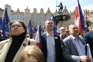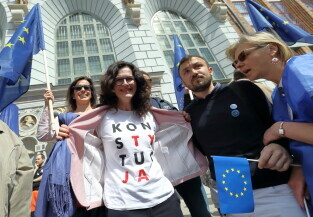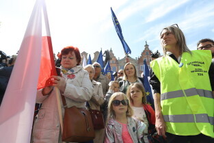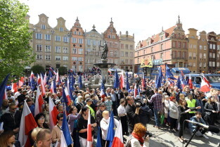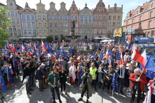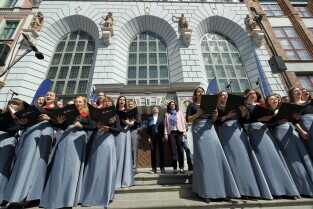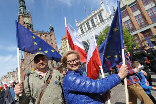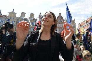 Gdańsk, przedproże Dworu Artusa. 15-lecie wejścia Polski do Unii Europejskiej. Nz. Prezydent Gdańska Aleksandra Dulkiewicz.