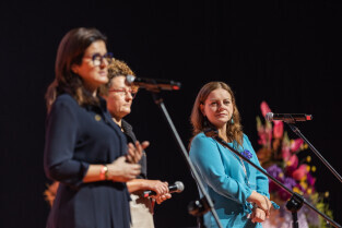 Gdańsk, Ergo Arena. 16. Kongres Kobiet. Uroczyste otwarcie. Nz. Od lewej Aleksandra Dulkiewicz, prezydent Gdańska, Magdalena Czarzyńska-Jachim, prezydentka Sopotu i Aleksandra Kosiorek, prezydentka Gdyni