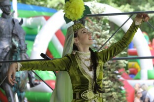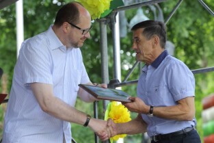 17 Wielki Festyn Rodzinny w Parku Oruńskim N/Z Jerzy Szahuniewicz Prezes Narodowego Centrum Kultury Tatarów RP wręcza medale Chana Dżelal Ed Dina.