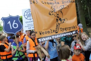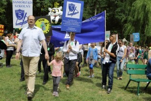 17 Wielki Festyn Rodzinny w Parku Oruńskim. N/Z Prezydent Gdańska Paweł Adamowicz na czele parady uczniów oruńskich szkół.