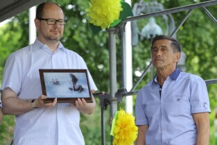 17 Wielki Festyn Rodzinny w Parku Oruńskim. N/Z (z lewej) Prezydent Gdańska Paweł Adamowicz wręcza Medal Kawalera Syrenki Oruńskiej Józefowi Alijewowi (z prawej)