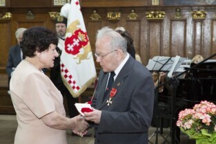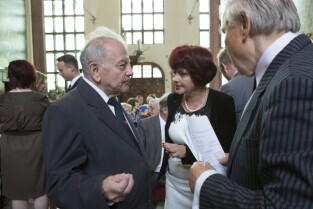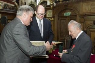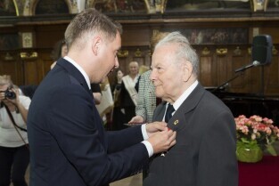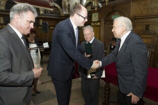 Gdańsk, Dwór Artusa. Uroczystość 20-lecia Stowarzyszenia Nasz Gdańsk oraz przekazania sztandaru organizacji. Nz. Prezes Stowarzyszenia Nasz Gdańsk Andrzej Januszajtis wręcza honorowe odznaki