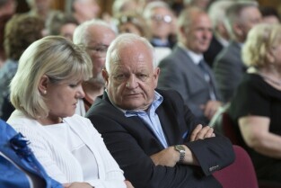 Gdańsk, Dwór Artusa. Uroczystość 20-lecia Stowarzyszenia Nasz Gdańsk oraz przekazania sztandaru organizacji. Nz. Dyrektor Kancelarii Prezydenta Gdańska Helena Chmielowiec i Prezes Stowarzyszenia Nasz Gdańska Andrzej Januszajtis