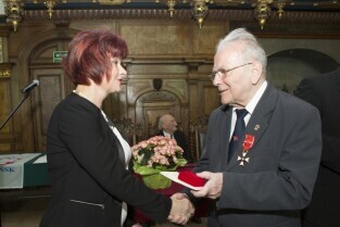 Gdańsk, Dwór Artusa. Uroczystość 20-lecia Stowarzyszenia Nasz Gdańsk oraz przekazania sztandaru organizacji. Nz. Prezes Stowarzyszenia Nasz Gdańsk Andrzej Januszajtis wręcza honorowe odznaki, po lewej Dyrektor Kancelarii Prezydenta Gdańska Helena Chmielowiec