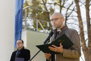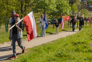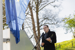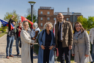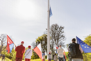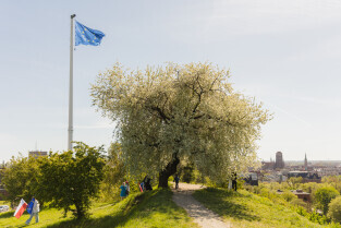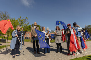 Gdańsk, Góra Gradowa. 21 lat Polski w Unii Europejskiej. Wciągnięcie flagi. W wydarzeniu brał udział Piotr Kryszewski, Dyrektor Zarządzający ds. Zielonego Gdańska oraz radne miejskie, Jolanta Banach, Kamila Błaszczyk, Katarzyna Czerniewska.