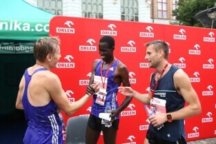 Gdańsk, 25 Międzynarodowy Bieg św. Dominika. Nz. Mistrz Polski, zdobywca II miejsca Marcin Chabowski i zwycięzca biegu Kenijczyk Silas Mwetich.