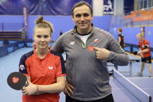 Gdańsk. 26 finał Wielkiej Orkiestry Świątecznej Pomocy. Polski Związek Tenisa Stołowego w swoim centrum przy ul. Meissnera 3 zorganizował akcję "Tenisiści Stołowi dla WOŚP". Nz. Katarzyna Grzybowska-Franc z Trenerem Michałem Dziubańskim.