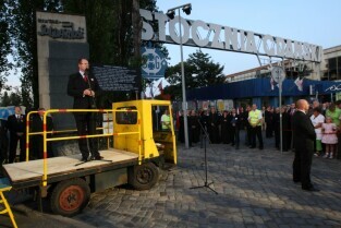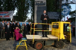 Gdańsk. 29. rocznica Porozumień Sierpniowych. Nz. kwiaty pod historyczną bramą nr 2 Stoczni Gdańskiej składa Marszałek Woj. Pomorskiego Jan Kozłowski