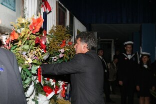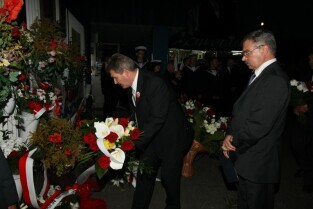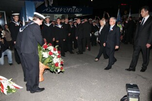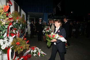 Gdańsk. 29. rocznica Porozumień Sierpniowych. Nz. kwiaty pod historyczną bramą nr 2 Stoczni Gdańskiej składa Wojewoda Pomorski Roman Zaborowski